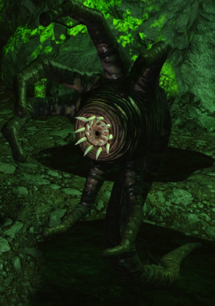 1 часть = Эти хищники обитают в смоляных ямах Черной Расселины. Эти таинственные беспозвоночные ожидают, пока жертва подойдет на достаточно близкое расстояние, а затем резко атакуют из своей засады, используя пальцевидные щупальцы для захвата и удержания жертвы, пока отвратительная ротовая полость измельчает ее на части.