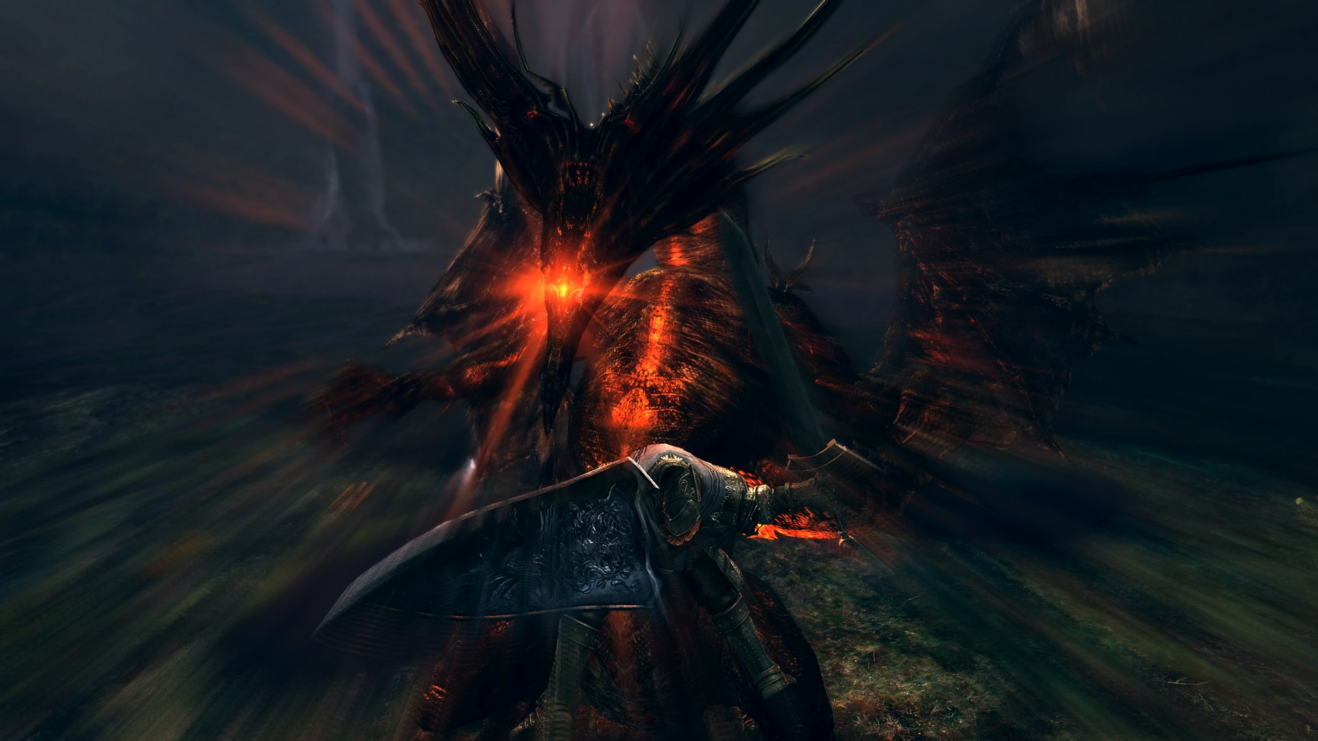 Взлёт. Используется, если игрок забрался наверх по лестнице и остался там. Дракон взлетает очень высоко и начинает дышать огнём справа налево относительно игрока. Увернуться невозможно, атака покрывает всю площадь возле туманных врат, урон огромный.